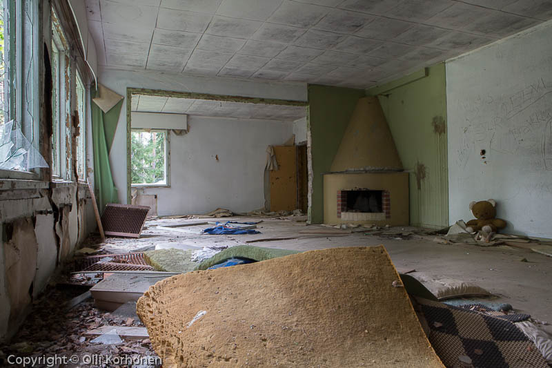 Hylätty Nalle suuren autiotalon kauniissa keltaisessa käytävässä.