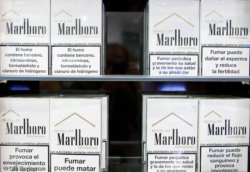 Malagan lentokentällä sain mahdollisuuden toteuttaa viime Venäjän matkalla syntyneen idean kuvasta symmetrisesti kaupan hyllylle asetetuista tupakkakartongeista, joista mahdollisimman useassa on eri teksti tupakan vaarallisuudesta.