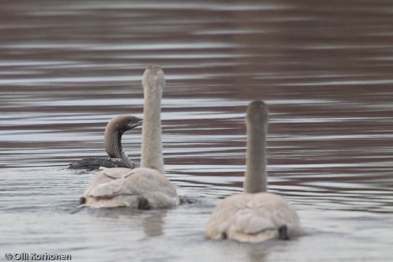 Tässä vaiheessa nuoret joutsenet olivat kuitenkin menettäneet mielenkiintonsa karkulaiseen, joten kuikka sai jatkaa häiritsemättä hiljaista uintiaan.