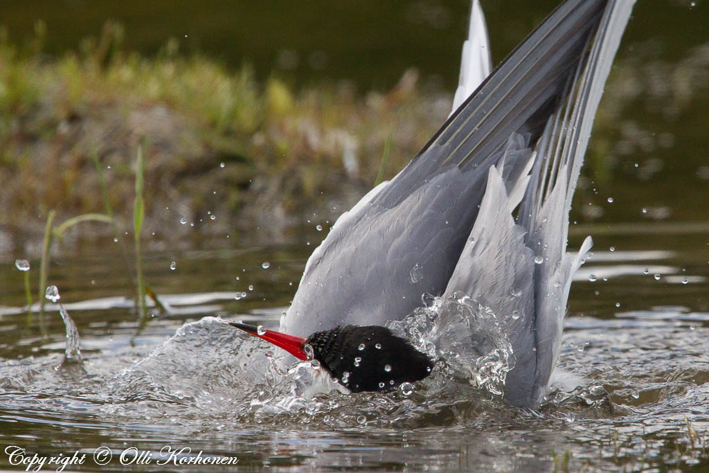 Meriharakkojen lisäksi alueella on tietenkin myös muita lintuja, joista eräs kalatiira innostui meriharakan mallin nähtyään kylpemään samassa vesilätäkössä kuin, missä tämäkin oli hetkeä aiemmin polskinut. Tietenkin myös tämä tilanne oli hyödynnettävä.